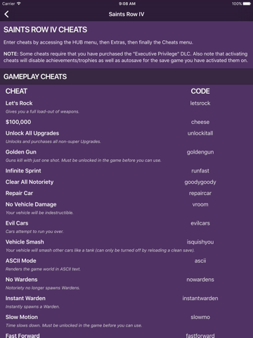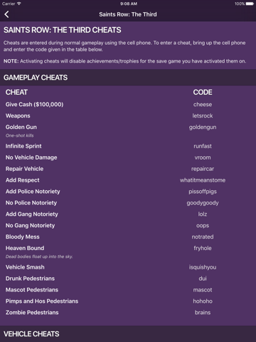 Cheats for Saints Row provides quick and easy access to every cheat code for every Saints Row game. Simply tap a games logo to see all its cheats.