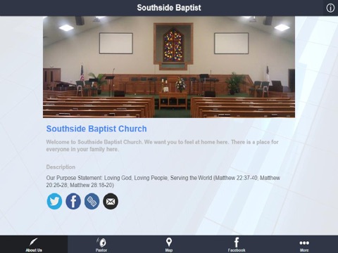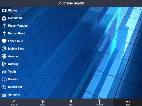 Mobile smartphone app for Southside Baptist Church in Paris Texas. Sermon audio can be listened too, as well as schedules and a group of church links...