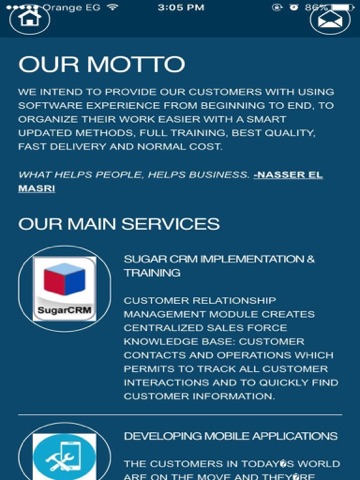 This application developed to show the completed portfolio for Specialised Solutions company by showing customers , contact us , about us , products , videos and gallery inside customer page user can see most of our customers and the projects we did with them also user can contact us easily by view our location on map or by calling us directly last but not least user can contact us by using social media like Facebook , LinkedIn and youtube .