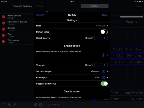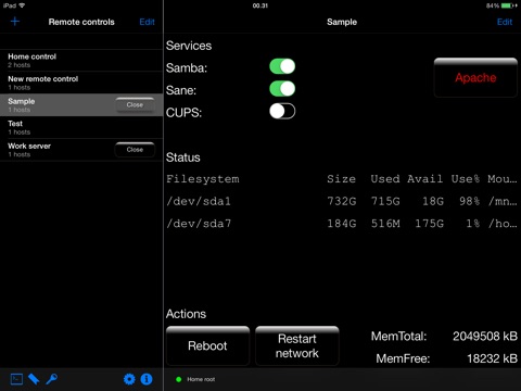 SSH Control is a powerful tool which allows you to control your remote servers via SSH protocol as easy as your TV using Remote Control. Create buttons, switches, labels, bind them to hosts and write shell scripts for various control events.