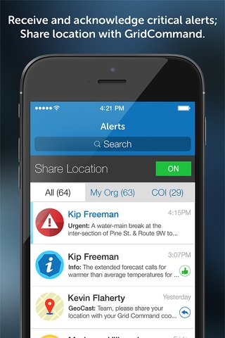 Receive critical alerts instantly from your agency coordinator in GridCommand, a web application that increases situational awareness, tracks teams, and advances interoperable communications. Acknowledge received alerts with "Accept" or "Reject" status, or choose "Reply" to alert sender with additional input. Push notifications will let you know when a new alert is received. Read receipts let your coordinator know whether youve seen the alert. A backup email will let you know about an alert when youre away from your phone.