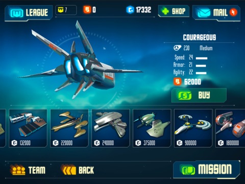 3. Many different space fighters. Light type: fast and maneuverable. Heavy type: slow but armored. And medium type: balanced. You can upgrade the engine, armor and rudder to improve its performance.