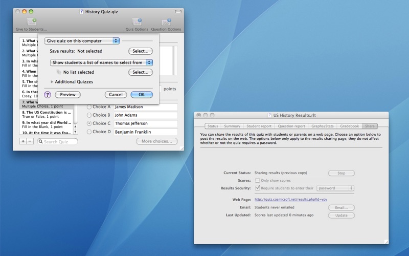 Its as easy as clicking "Give to Students..." and your quiz will be instantly uploaded to the Internet. Students can take it from any web browser. You can also print the quiz on paper, or use the secure starQuiz NetClient software to ensure students cant access other programs while taking the test. (Important: tests are limited to 1 megabyte of resources. To upload larger tests, you can upgrade to our starQuiz Pro app.)