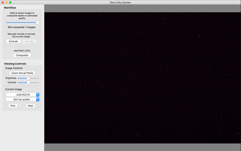 Starry Sky Stacker reduces noise in pictures of the night sky that are captured as a sequence of exposures taken with a modern dSLR or mirrorless camera using an equatorial mount. Starry Sky Stacker aligns the images to compensate for errors in tracking, assigns a quality estimate to each image, allows the user to select images based on the quality estimate, and composites the remaining images. The resulting image has much less noise than any of the original images. Neither alt-azimuth mounts nor cameras that generate FITS files are supported. A free trial version is available at the developers website.