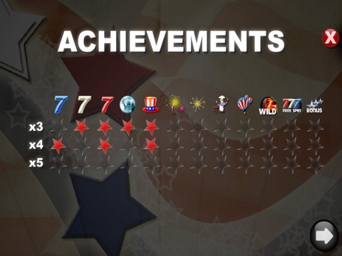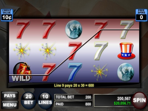 Stars And Stripes (5 Reel Slot Machine) with more features, more lines, higher limits, and more chances to win than ever before! Swipe up for a max bet if you’re feeling lucky. Swipe down to spin the reels. Up to 30 credits per line and up to 15 lines per game give you the winner’s edge! Changeable credit values ranging from 1¢ to $10. Daily game cash rewards just for playing. Earn your way to 60 trophies in this Independence Day themed slot machine.