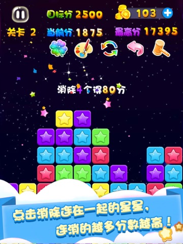 We have the most fascinating classic mode -- click two or more stars in the same color can be removed, no time limit, but each level targets have scores, reach the target score can into the next checkpoint. If pass before the rest of the star number less than 10, will also get the bonus.
