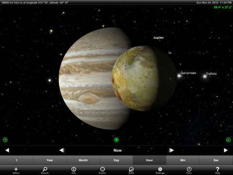 Tap the Time button in the toolbar to animate the flow of time, forward or backward, continously or in single stpes, by seconds, minutes, days, months, or years at a step. Tap "Now" to simulate the galaxy as it exists this very second, and update it in real time.