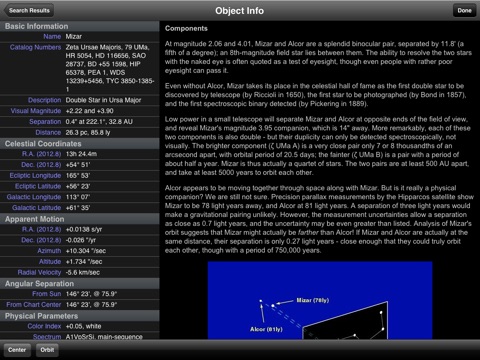 To learn more about the object youve selected, tap the Info button in the toolbar. To center it on the screen - without flying into orbit around it - tap the Center button.