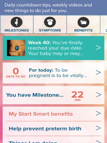 The Start Smart for Your Baby® app is for educational purposes only. Medical advice is not provided. Do not rely on information in this app as a tool for self-diagnosis. Always consult your doctor for appropriate examinations, treatment, testing, and care recommendations. In an emergency, dial 911 or visit the nearest hospital.