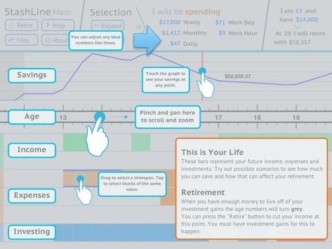 StashLine is an app for planning your financial future. Enter your expected income and expenses on a beautiful timeline and see how much you can save.