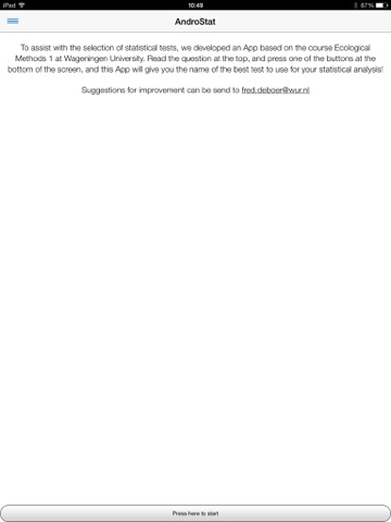 This App was developed based on the course Ecological Methods 1 at Wageningen University, The Netherlands. This course aims at improving the use of statistics to test hypotheses by researchers in ecology. It assists researchers with the selection of statistical tests by asking questions about the nature of the dependent variable and the independent variables that were collected in experiments or field studies. Using these questions, the App will lead the researcher step by step through a decision tree that ends with the best statistical test for testing the hypothesis using the collected data. It reports all the steps in the decision process as a summary so that the researcher can re-evaluate all the steps taken.