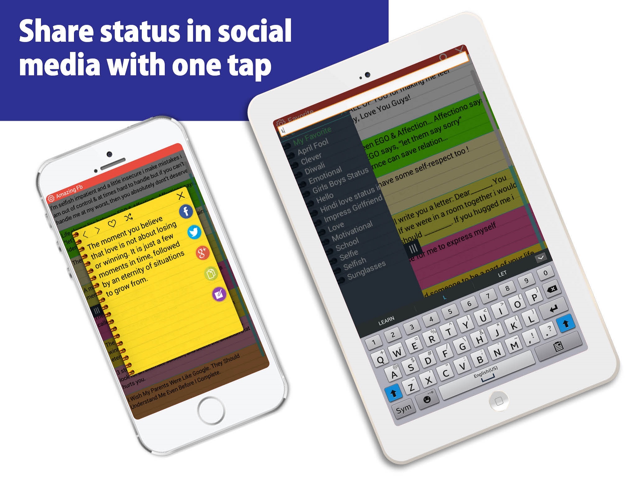 Search your thoughts/ emotions, feelings, joys and other such things , find appropriate status result and share them with friends on social media with just one click.