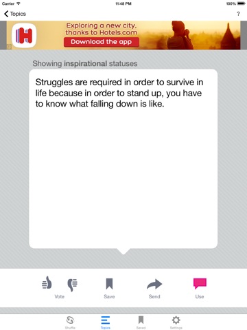 I love Status shuffle, but this one is quite dissapointing! U only get a certain amount of free status! Yea ok! But everytime u only SHUFFLE, your "free" status goes down as wel! E.g.: if u have 100 free ones and used 7 and shuffle 93 times: non left! Full of crap