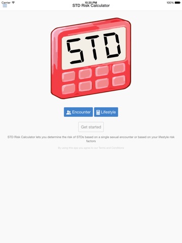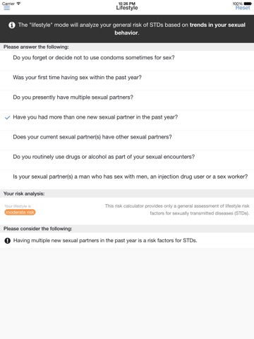 There are two modes that the app supports. The "lifestyle risk" mode tells your chances of getting sexually transmitted infections (STIs) based on your general risk factors. The "single encounter risk" mode tells you your chances of get STI based on specific details of a sexual encounter and the specific details about your partner that determine his or her risk.