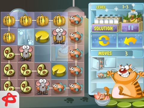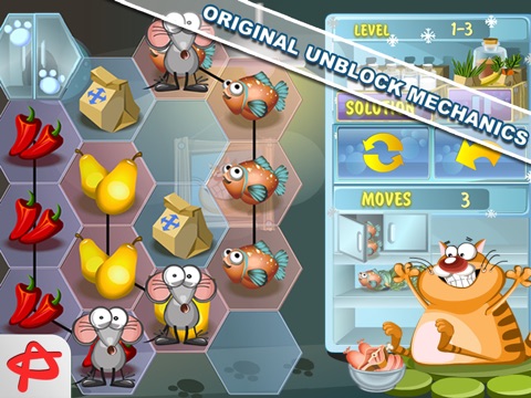 A fat red cat (no, not Garfield) always wants to eat. The only way for the mice to survive is to supply him with meat. Help them swipe some treats out the fridge in Steal the Meal: Unblock Puzzle. Move the mice with the strings of vegetables and fruit on the playfield to lead for the breadwinner to the door. Various obstacles will stand in your way. Some of them are movable, others have to be passed round. Apply your unblock skills to make the least moves and earn 3 stars. Sneak your way through 20+ puzzle levels and unlock new level packs free! Enjoy funny animated characters and original snakes game concept with a comic brain-teaser!
