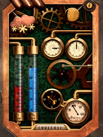 Get this beautiful application and check the live weather conditions and the 5-day forecast for your location. Steampunk Weather features an interactive, animated interface with original steampunk stylized artwork and sounds.