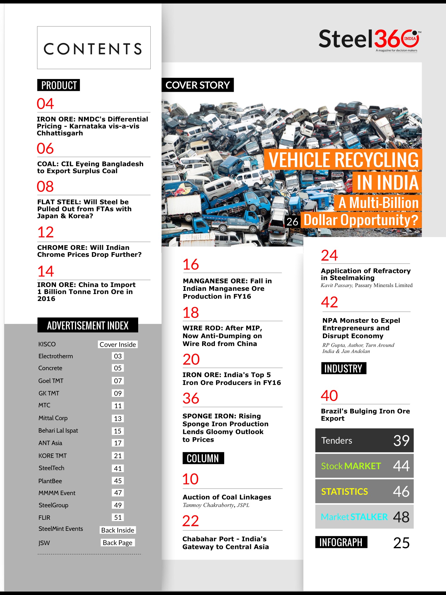 Steel 360 is a monthly magazine covering the metal and mining industry in India. The magazine is currently read by over 5,000 people in the metal and mining fraternity across the country (print circulation only in India). Each issue of the magazine carries a highly informative cover story; write ups on trending topics, market prices & offers, current news from the metal & mining industry, latest technology trends, columns from industry veterans, import-export statistics, information on upcoming events and much more.