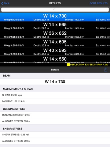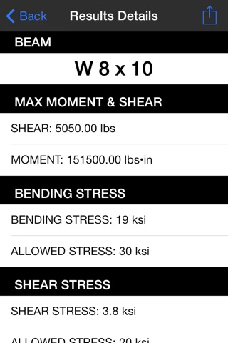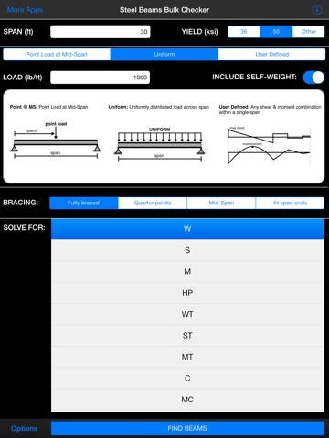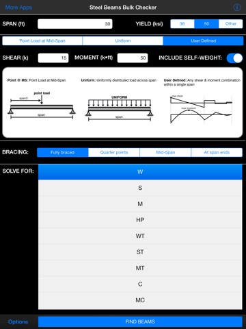 Simple, easy-to-use app that will allow you to determine which beam is the right one for your needs. Calculations appear to be right on the money. I used this app to confirm the deflection of a single point load in an I-beam and the measured deflection matched the deflection calculated by this app to within a couple thousandths of an inch. Really made beam load what-ifs easy and quick. Definately worth the money and the developer has been very quick to respond with thorough answers to my questions. Thanks!!!