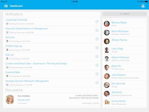STEKIO provides executive learners with a new learning experience; they feel connected to their peers and program managers. Using the STEKIO iPad app, they can check out peer profiles, receive regular updates and scheduling information from their program manager, access course content, and communicate with peers either using email, instant messaging, by starting a discussion, or hopping on someone else’s discussion thread.