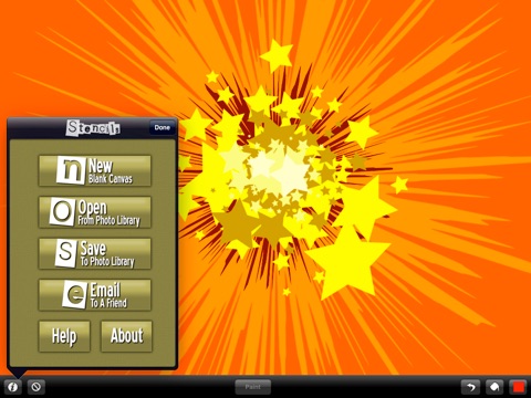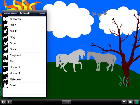 Stencils includes a huge library of over 120 stencils built in and utilizes a great multitouch interface when positioning your stencils. Once you choose your stencil, you can move it with one finger, then use two fingers to rotate or scale it. When youre ready to paint, you can choose a color then start filling it in. Theres also a paint bucket option to fill in the whole stencil in one click.