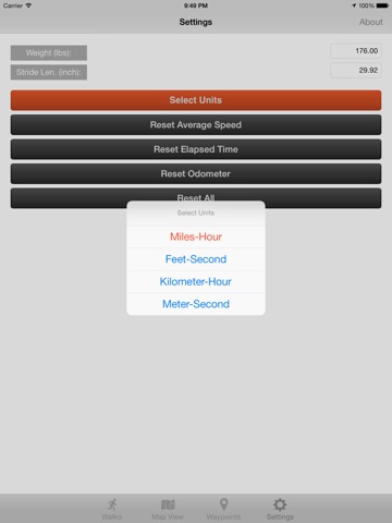 Units: Metric (KM, KMPH, Meters, meters/sec.) and English (Miles, MPH, feet, feet/sec.)