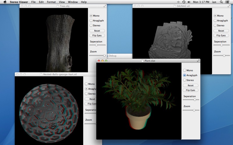 Viewing 3D model files on screen is usually a "flat" experience, but Stereo Viewer provides a quick way of displaying obj, dae (Collada), and stl files in full 3D.