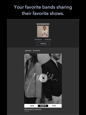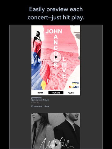 Bands know the scene and they know where to find fun. Follow them to get a stream of concert recommendations, each presented with a stereoposter created by a band. A stereoposter is an interactive concert poster that includes music, pictures, show info, and a link to get tickets, all in one elegant and shareable package. It’s easy to preview all of the amazing shows going on — just hit play.