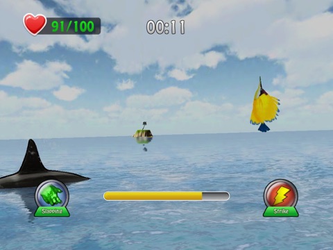 Stickman pi is traveling on the ocean.The ocean is a very dangerous place,so stickman pi must keep awake all the time.Stickman pi can slap or strike himself to keep awake.Stickman pi have 100 health point,slap and strike will cast his hp.If the hp is less than 0,stickman pi will be dead.Fortunately food can be found in the ocean, the banana and the cake can recover stickman pis hp.The ocean not only has food,but also has dangerous animals,so be careful.