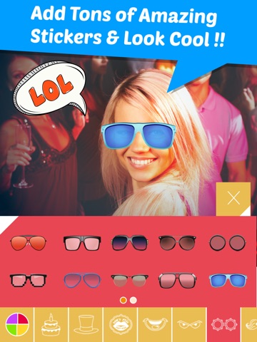 14 different categories of stickers and props like Happy Quotes, Real Shades, Halloween, School Kit, Birthday, Hats, Expressions, Eyes, tress, bushes, texts, Mustaches, retro shades and glasses which will make the pictures as beautiful and creative you desire.