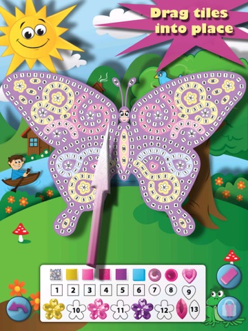 Sticky Mosaics® Butterflies iPad app provides hours of fun and entertainment. It will allow your child to lose themselves in a world of magic, imagination and artistic freedom. Each of the four templates has numbered placeholders, corresponding to a variety of different colored and shaped jewels. Kids assemble their mosaics by dragging the jewels from the legend with their finger. By matching the jewels with the correct number, your child will start to create a shimmering mosaic of a beautiful butterfly. When the last jewel has been added, something magical happens. The butterfly will come to life and fly around. The butterflies are shy, but if you hold your finger to the screen very still, the butterfly will come and land on your finger.