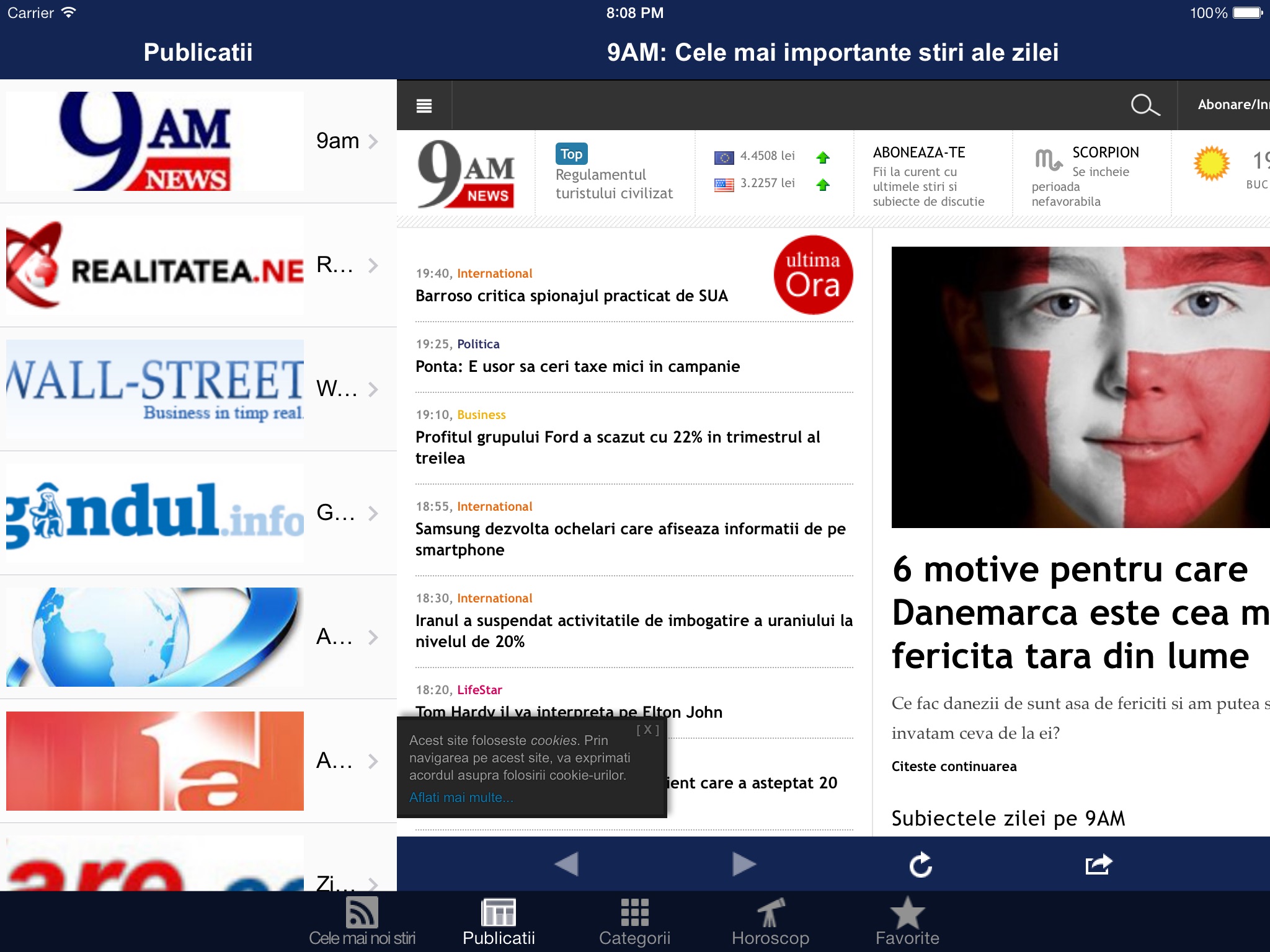 Aplicatia contine informatii din cele mai importante 22 site-uri de stiri si informatii mondene din Romania. Continutul este impartit in categorii si ofera utilizatorilor in fiecare minut cele mai relevante si importante informatii.