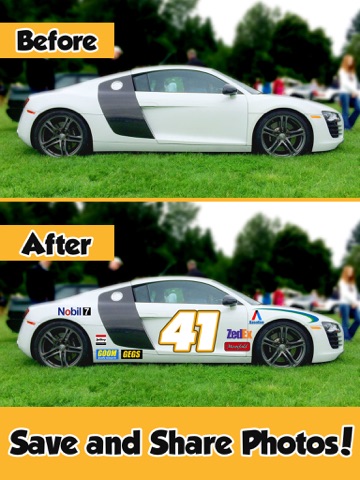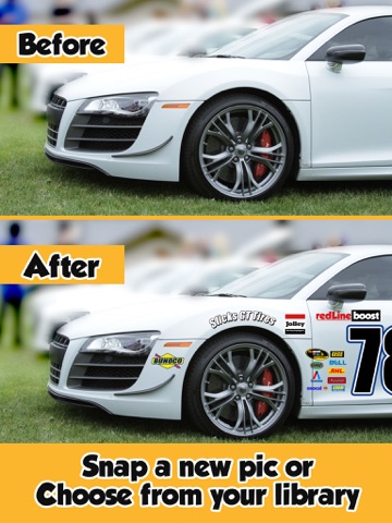 Stock Car Photobooth can turn any vehicle into a pro stock car instantly with racing stickers and numbers! Show your friends the coolest car in the neighborhood. Simply take a new picture or choose one from your library and add sponsors, graphics and your favorite stock car racer’s number to your photo! Adding racing graphics takes seconds and you can impress your friends instantly!