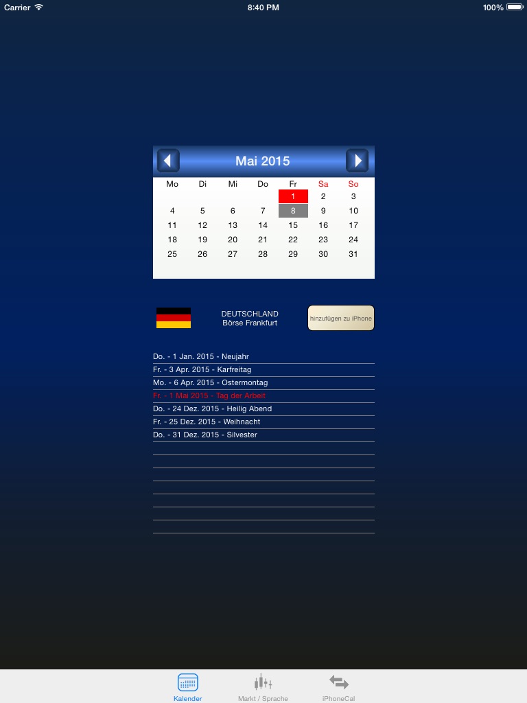 Stock exchange holiday calendar for the main markets in USA, Canada, Australia, Great Britain (London Stock Exchange), Italy, Germany, Austria, Switzerland, France, Japan, Brazil, Chile, Mexico. All stock exchange holidays until end of 2021. Multilingual: English, German, French. The selected market holidays can also be added to iPhone calendar.