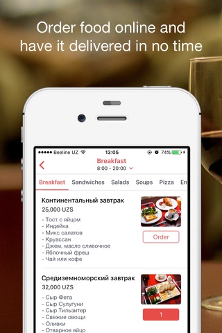 Our app has the best collection of venues in Tashkent and offers cuisine selection for all tastes: pizza, sushi, plov, salads, burgers, pasta, coffee, and desserts. New partners are added daily.