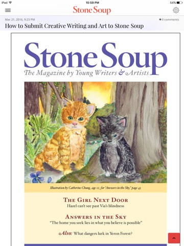 We raised our children with Stone Soup magazine. This journal has always encouraged and published quality words and visual art from children who so clearly benefited for the experience of being published....as much as we benefitted from they fine work. Now Stone Soup goes electric with a fine pixel version of their journal that lives up to the quality of their paper journal. Now when I am on a long line at the bank I can stay content while catching up with Stone Soup authors and artists.