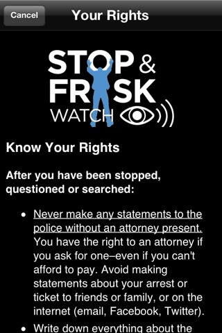 Stop and Frisk Watch app allows bystanders to fully document stop-and-frisk encounters and alert community members when a street stop is in progress. It has three primary functions: