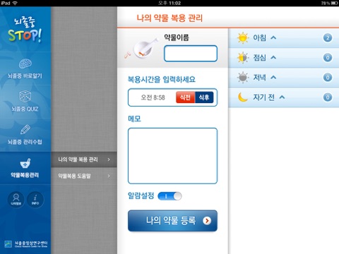 - 뇌졸중 치료에 중요한 약물의 복용시간을 알려주는 알람기능이 있습니다.