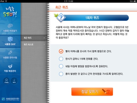 - 뇌졸중에 관한 간단한 지식을 확인할 수 있으며, 향후 지속적으로 새로운 퀴즈의 업데이트로 뇌졸중에 대해 좀 더 자세한 정보를 얻을 수 있습니다.