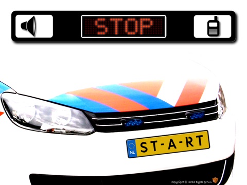 Na het openen van de app kom je in het startscherm terecht. Bovenin het scherm zie je de woorden STOP,POLITIE knipperen. Naast dit bord zitten aan weerszijde 1 knop met elk een geluid. Links de sirene de Nederlandse Politie en rechts de portofoon.