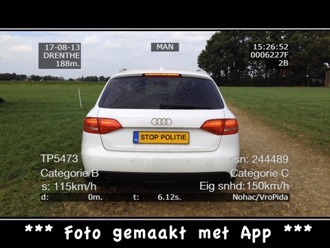 Met deze app heb je dezelfde functionaliteit (en meer) als de Politie in handen. Je kan de gemiddelde snelheid (traject controle) van een ander voertuig meten, je eigen snelheid meten en de overtreders op de foto zetten. De foto wordt automatisch in je fotoalbum geplaatst, zodat je deze makkelijk kan doorsturen.