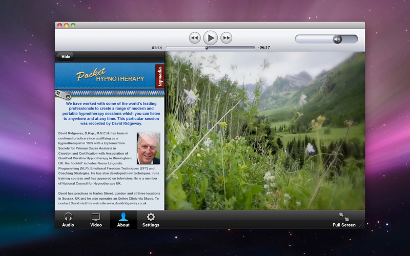 Each track in this app is a combination of words spoken by certified hypnotherapist David Ridgeway* and soothing, uplifting "binaural" music.