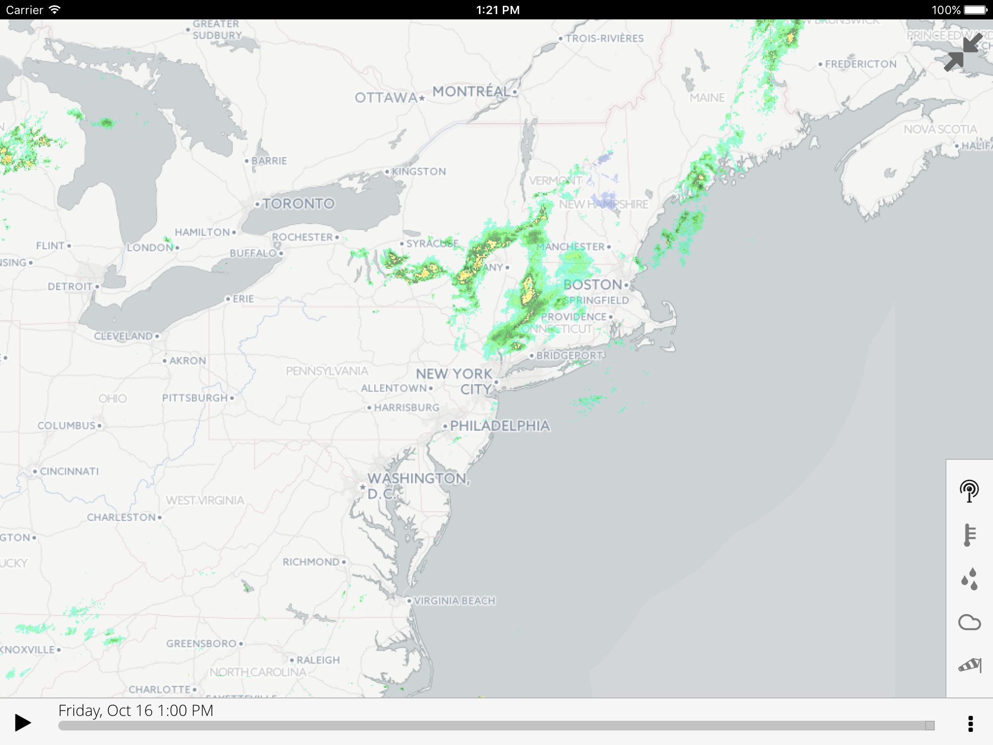 In the upper right there is an empty icon the only tells you something more may be coming but not what it might be. The wind direction arrow is not intuitive to interpret. Is it the arrow head pointing direction the wind is coming from or going to. Location - I am in Gloucester Ma the geolocation system reports I am at the USCG Heliport. There is a USCG base about a half mile from me but this is not helpful. The scrolling ad on the top brought me to an advertisers space but would not let me return to the site. There are no setting for severe alerts.