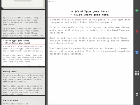 • Quickly swipe from card to card, enter text content and descriptions, move cards around -- anything you can think of doing with a regular ol stack of index cards, and more!