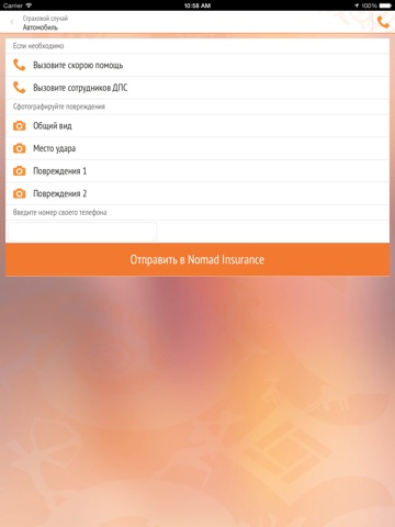 Если вы попали в ДТП или наступил любой другой страховой случай, приложение поможет Вам максимально быстро связаться с сотрудниками Nomad и получить квалифицированную помощь и инструкции.