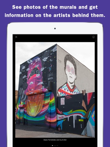 See photos of the murals and get information on the street artists behind them including links to their websites and social media.