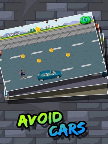 Press screen to make skateboard and skater move up the screen to the far edge of street. Stop pressing screen to move down to the lower edge of street. Avoid cars along the way. Collect coins and power ups to unlock new challenging levels. Power ups add to the excitement.