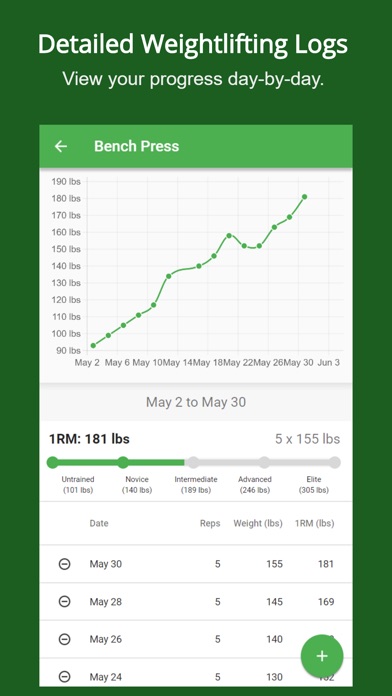 Configure Strength Standards with your gender and bodyweight to find performance standards for 11 different exercises. Visualize your progress with graphs showing your one repetition maximums over time to see how far youve come.