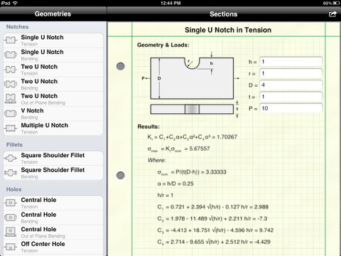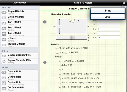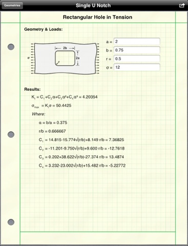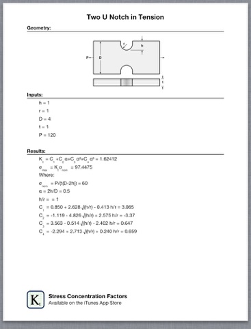 Sometimes simple stress formulae are not enough. The real peak stresses in hardware occurs at geometric discontinuities such as notches, holes, & filets. To get an accurate stress value, you need a stress concentration factor. This app makes that easy. Along with stress concentration factors, this app calculates the nominal and peak stresses, displays the equations, & easily prints or shares via email your result with a couple of taps.