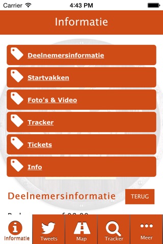 De ‘app’ biedt naar de unieke tracker functie ook ‘up to date’ informatie over het evenement zelf. Het evenementen programma, waar kan je parkeren, laatste informatie over het openbaar vervoer en loop routes voor de toeschouwer.