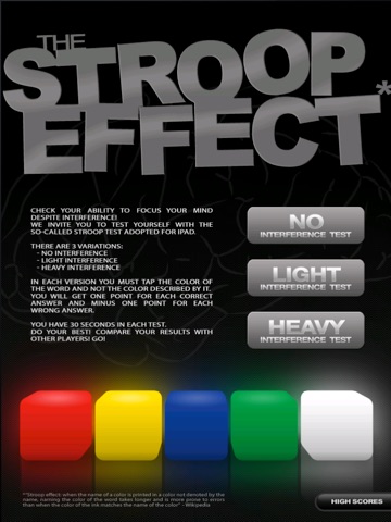 Stroop Effect app is a fun experiment in neuropsychology. Find out how your brain is playing tricks on you. See if you can train your brain to ignore interference.